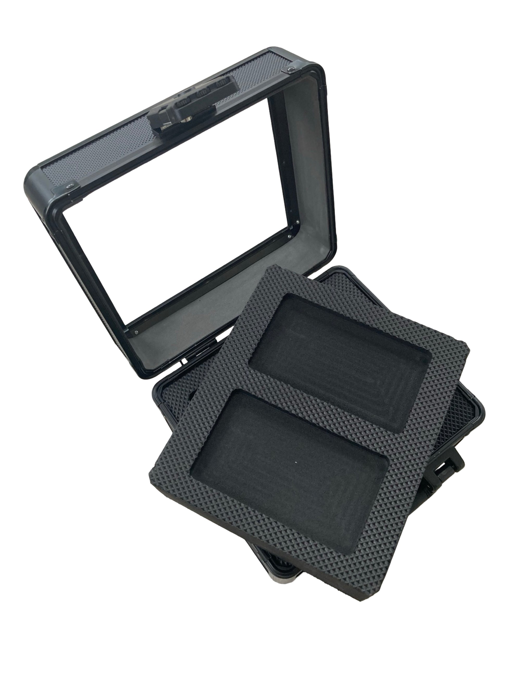 * to put the 2 slabs in the front window, please open the case and gently remove the foam in the lid. Place the 4 slabs in the slots while the foam is horizontal so the slabs are flat. Place this on top of the internal storage and close the lid onto this.